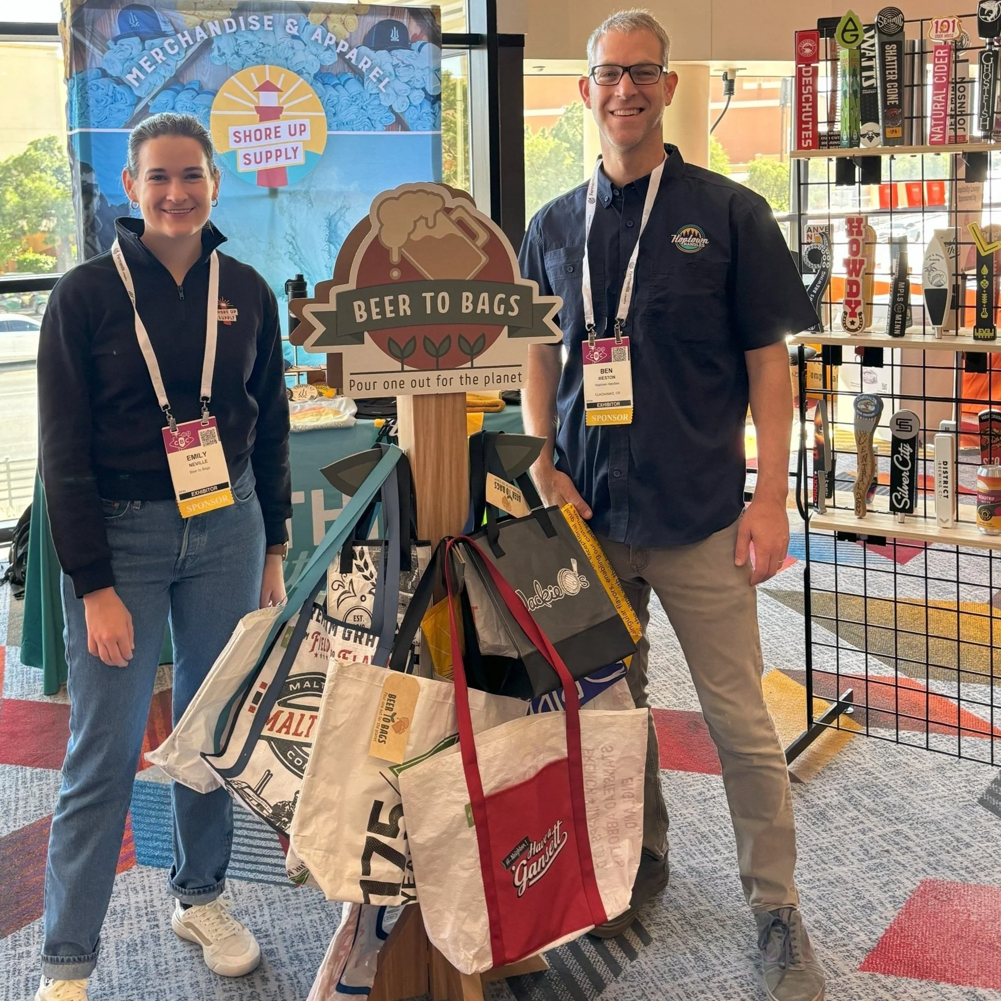 Beer to Bags Founder, Emily Neville, and Hoptown Handles and Shore Up Supply Founder, Ben Weston getting attendees STOKED on Beer to Bags during the 2024 Craft Brewer’s Conference.